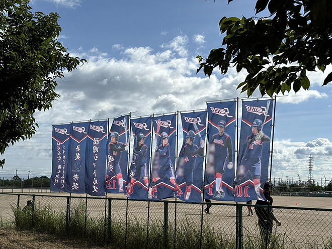 福岡県の女子ソフトボールチーム「福岡シャトルズ」様より、選手のぼりのご注文をいただきました。チームカラーのネイビーを基調に、ユニフォームに合わせた赤と白のラインを入れたデザインです。チーム名とスローガン入りののぼりも一緒にご注文いただき、選手のぼりとお揃いのデザインに仕上がりました。
