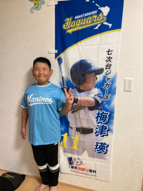 七次台ジャガーズ 梅津 瑛さんののぼりを製作させて頂きました。サイズはレギュラーのぼり、等身大以上の大きさで迫力あります!ご家族皆様に気に入って頂けたようで良かったです。